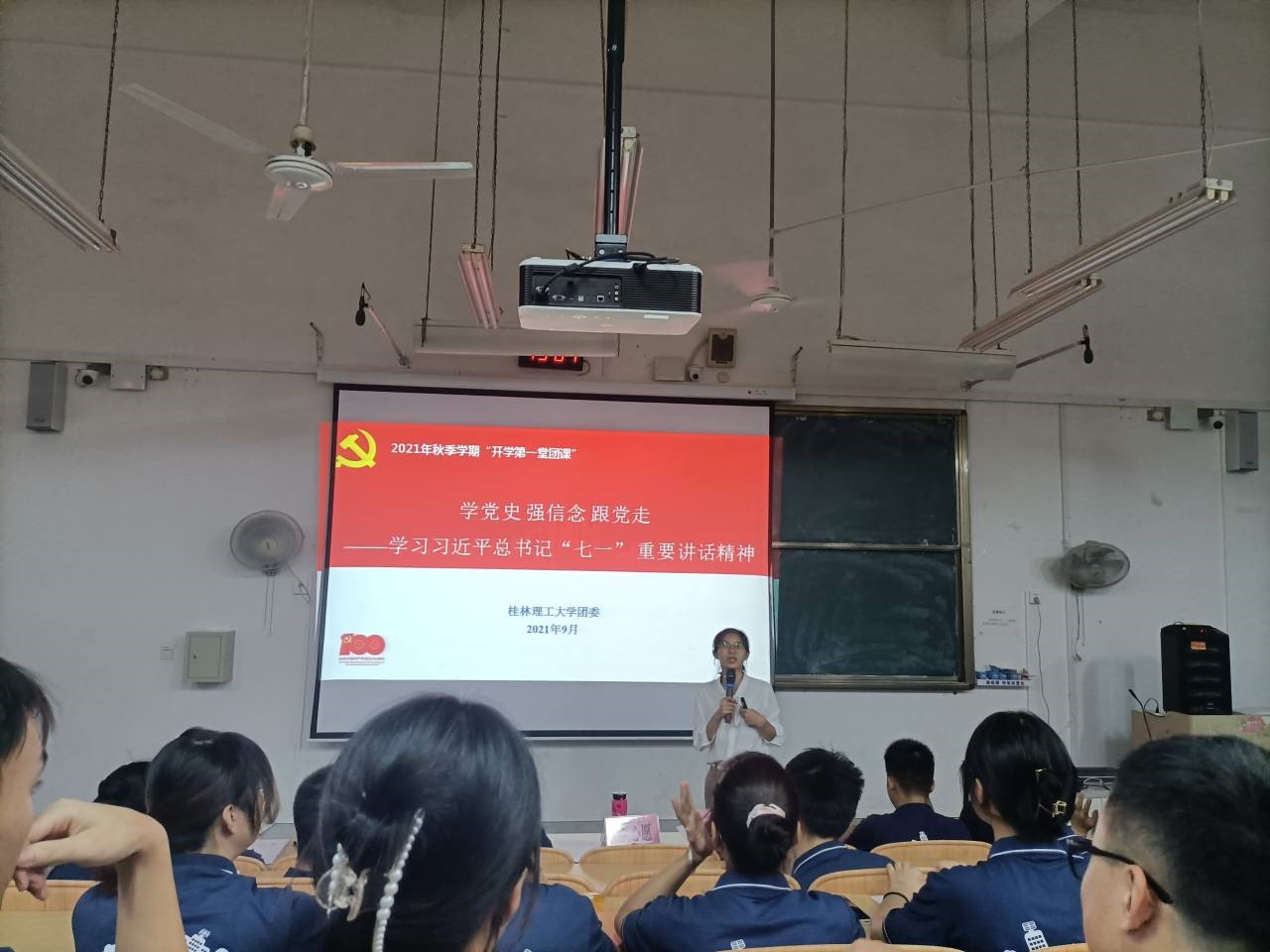 在致远楼04109教室开展2021秋季学期主题为学党史强信念跟党走,学习习近平总书记“七一”重要讲话精神的“第一堂团课”。李心愿老师阐述了“七一”重要讲话的重要意义,她提到,“七一”重要讲话是马克思主义的纲领性文献和政治宣言,是向第二个百年奋斗目标迈进的总动员,是我国全面建成社会主义现代化强国的根本遵循。同学们从中了解到“七一”重要讲话既是对中国共产党百年奋斗历程的全面总结,也是中国共产党团结带领人民以史为鉴、开创未来的行动指南。接着,李心愿老师就中国共产党诞生的必然性讲解了中国共产党诞生,并提及“四大成就”:新民主主义革命时期中华人民共和国成立;社会主义革命和建设时期,党的十一届三中全会的召开;改革开放和社会主义现代化建设新时期,党的十八大召开;中国特色社会主义新时代,党的十八大召开至今。
