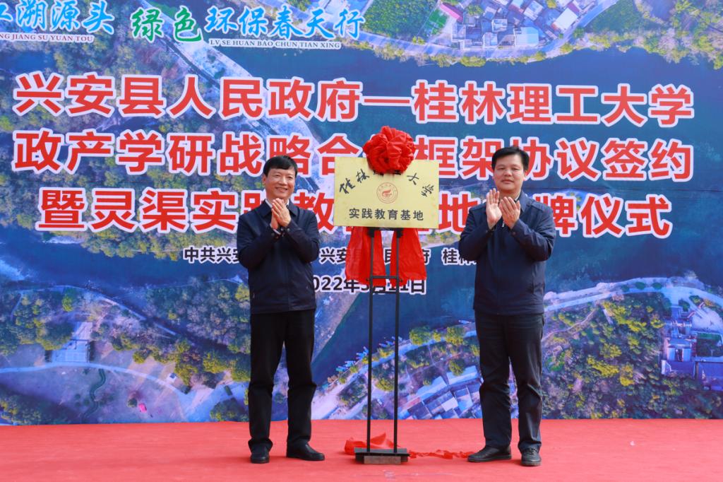 的师生们共同见证了我校联合兴安县人民政府共同举行的政产学研战略合作框架协议签约暨灵渠实践教育基地揭牌仪式。
