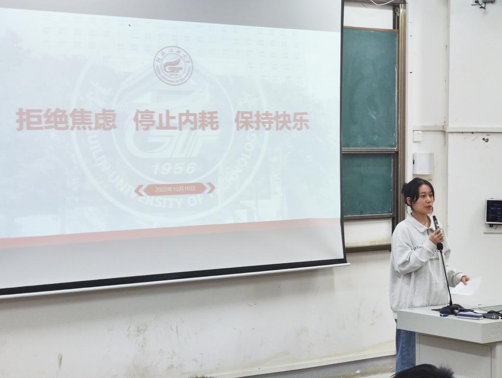 在雁山校区04621教室组织开展了朋辈心理健康知识分享会。分享会由黄甜甜老师主持,由3位优秀心理委员代表作为主讲人进行分享,21级全体同学参加。