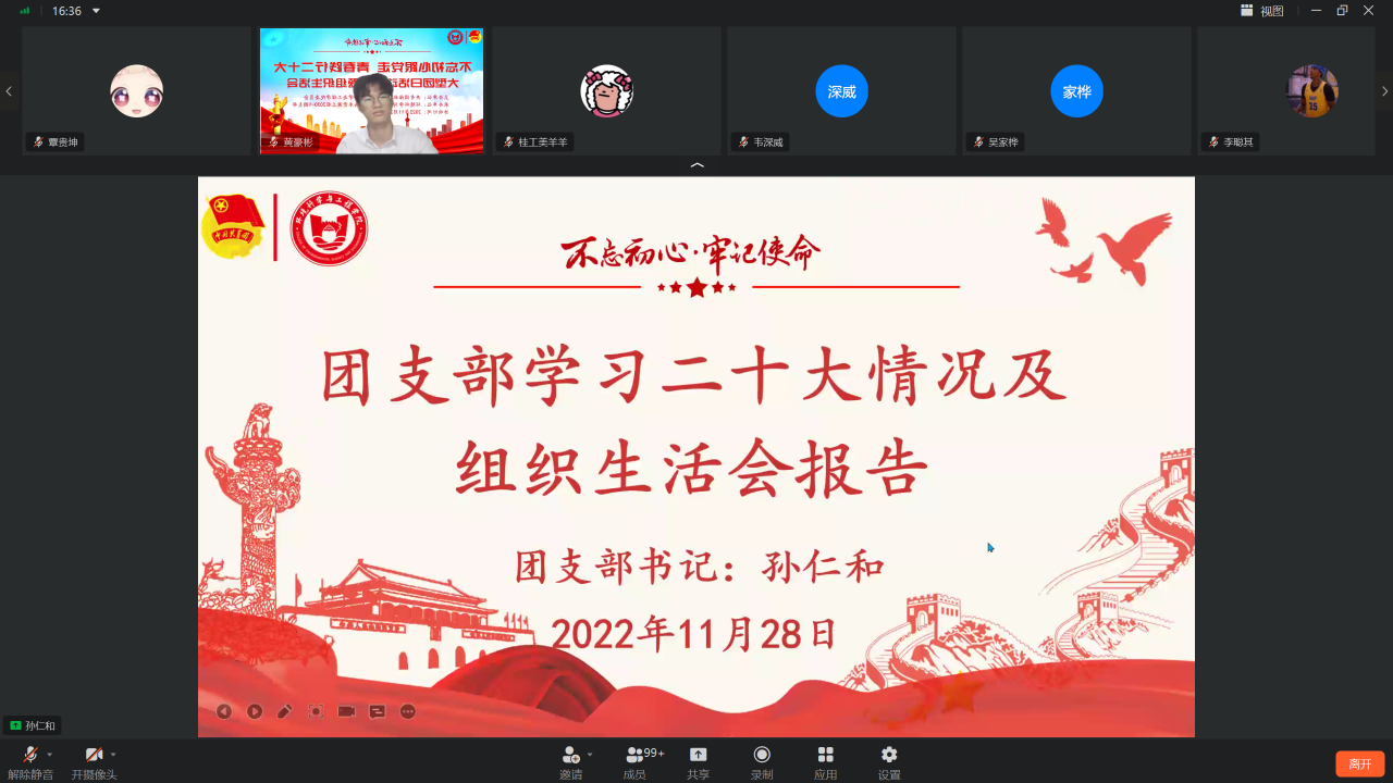 大会第一项,全体奏唱中国共青团团歌。随后,由水文与水资源2020-1班团支部书记孙仁和同学汇报团支部一年来开展“学习二十大、永远跟党走、奋进新征程”主题教育实践活动情况,团支部成员就学习贯彻党的二十大精神,结合个人思想和学习工作实际,交流学习体会、对标先进标准、查找差距不足、激发责任担当。接着,由团委书记李心愿老师围绕“齐心协力,共克时艰”开展思政大讲堂,分析当前我们所面临的来自疫情的严峻考验,让青年团员们看到我校党员教师勇担使命团结抗疫的身影,呼吁同学们理解并积极配合学校开展抗疫工作,向优秀党员学习,齐心协力,共克时艰。最后,大家在屏幕前重温入团誓词。