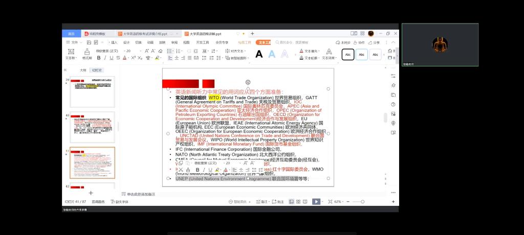 为更好的帮助同学们提高英语学习能力,备战2023年6月的全国大学英语四级考试,2023年2月13日,学院特邀文都考研耿飙老师,线上为同学们讲授了《四级直通车》。