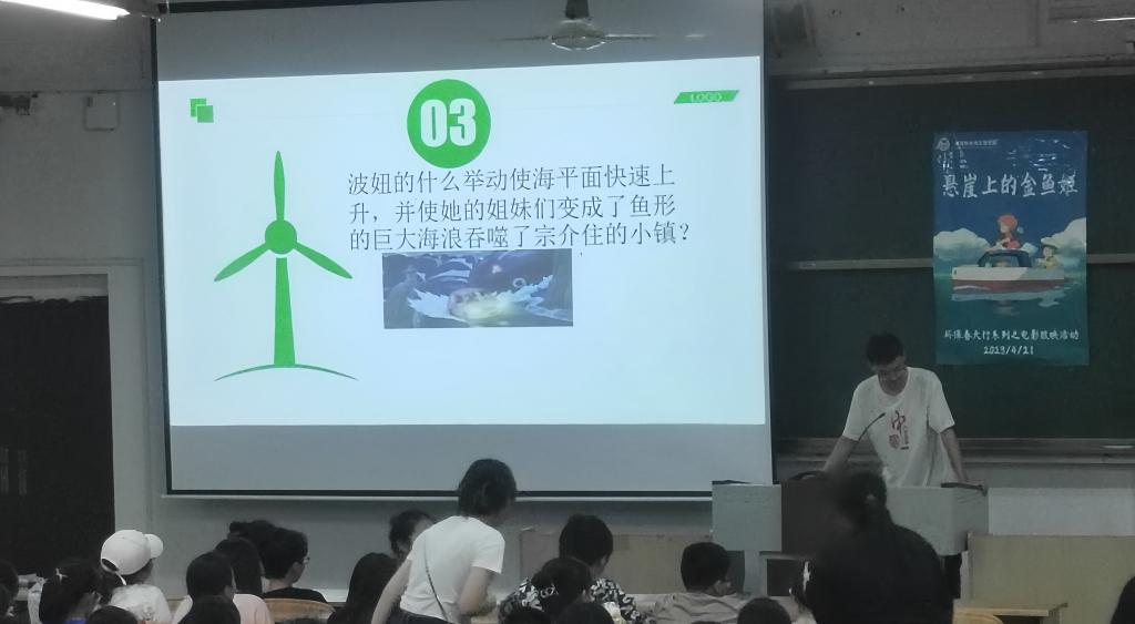 旨在通过举办观影活动,让更多的同学意识到人类与自然要和谐共处,一个代表着人类所有美好精神的男孩宗介,与一个代表自然之美的女孩波妞,彼此相亲相爱,人与自然,和谐共生。