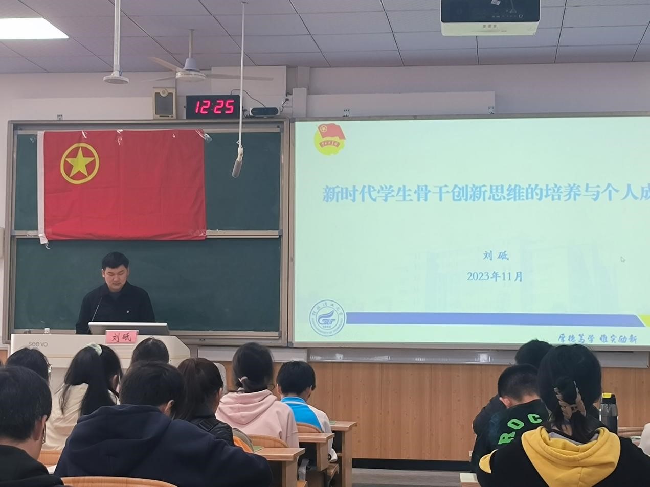 在06408举办了主题为“新时代学生骨干创新思维的培养与个人成长”团校培训暨青年马克思主义者培养工程大学生骨干培训班第三讲,本期培训班授课的老师是学院团委书记刘砥老师。