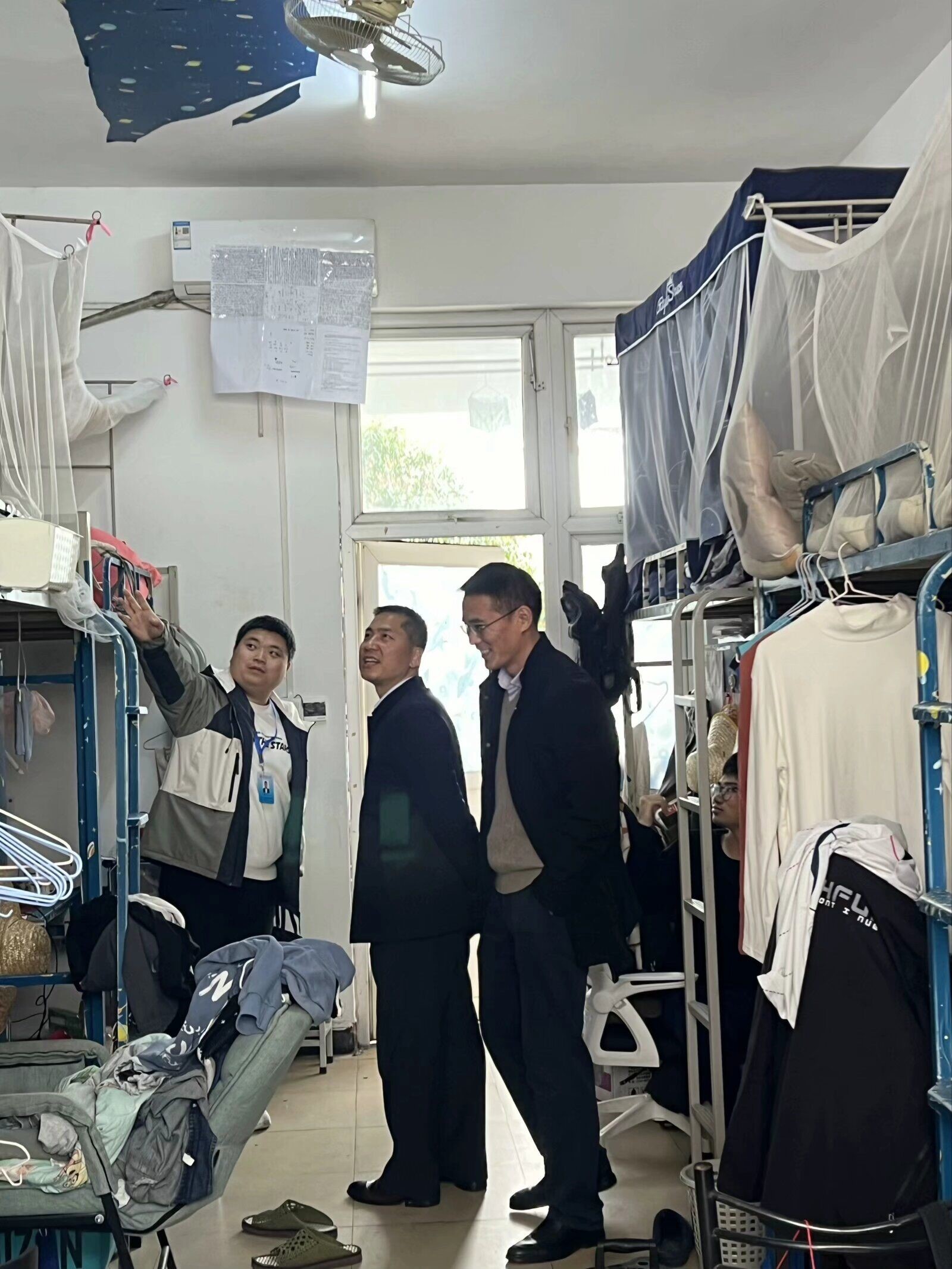 会前,进行了学生宿舍安全隐患大检查。走访过程中,代书记热情与同学们交谈,深入了解研究生同学们的心理状况,了解本科毕业班学生就业签约情况,并针对性地为不同就业意向的毕业生提供就业指导。年级辅导员们提醒同学们要注意消防安全和饮食安全,及时清理宿舍垃圾,消除安全隐患。