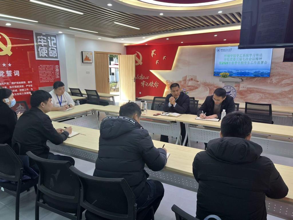 在“明园”一站式学生社区会议室召开学习传达学校党委三届七次会议精神暨2024年春季学期学生工作部署和学生安全稳定工作会,学院党委书记代武社、学院全体专兼职辅导员参加会议,会议由学院党委副书记叶大相主持。