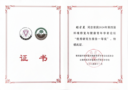 张学洪教授团队2021级博士研究生陈某一兴、2022级博士研究生赖才星参加此次论坛并分别以《李氏禾对镍胁迫的生理和生化响应:抗氧化防御机制和金属解毒策略》和《原位高分辨成像技术联合多组学阐明巨大芽孢杆菌对青葙根际微生态的调控机制》为题,在研究生专场做学术报告,受到了与会专家的高度肯定,其中赖才星同学荣获“优秀研究生报告一等奖”。