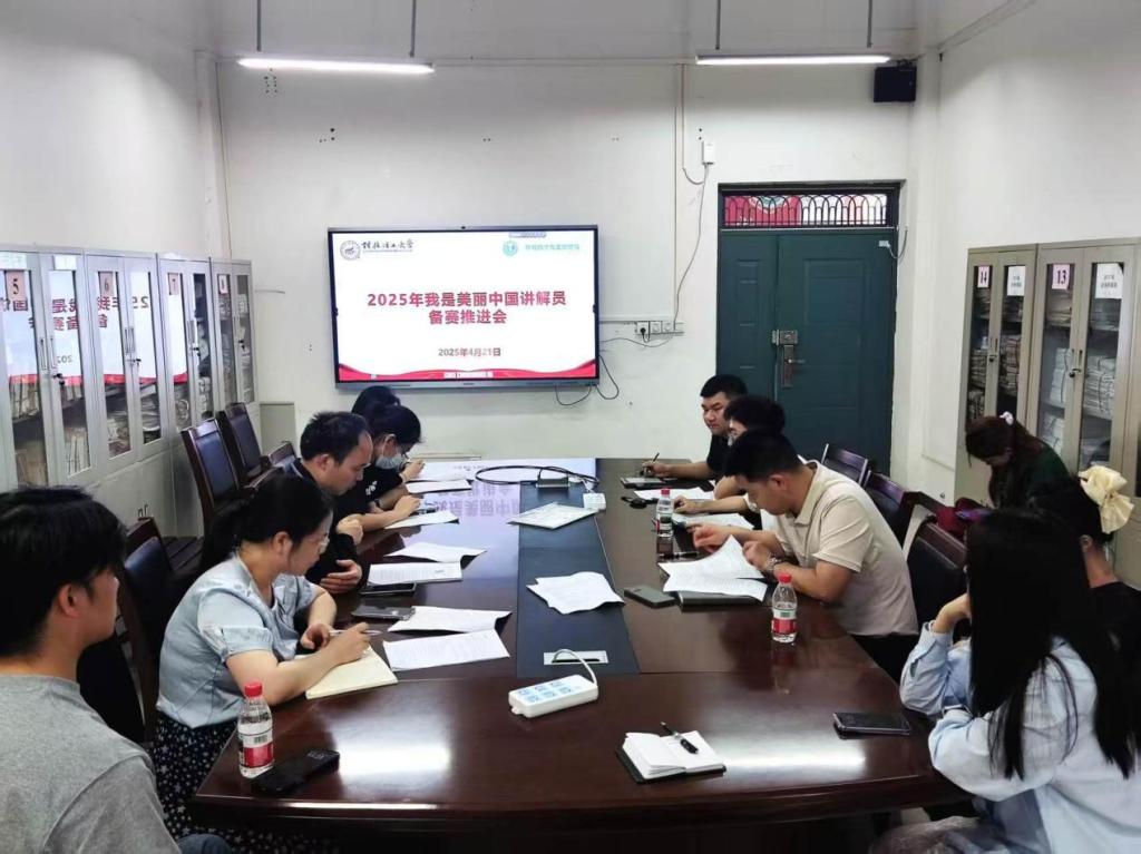 在12415会议室召开2025年“我是美丽中国讲解员”备赛推进会,旨在动员师生积极参与广西赛区选拔赛,并部署相关工作。会议由学院相关负责人主持,各参赛选手指导教师及学生代表参会。