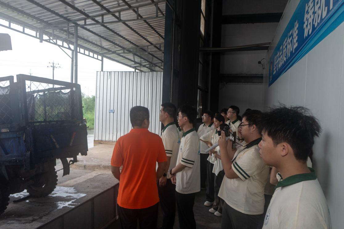 园区展厅内,产业园工作人员向实践团系统介绍了园区定位、产业布局及发展历程。园区依托重大战略机遇,重点发展服装纺织、玩具制造、农产品加工等产业,且始终贯穿“生态优先”理念,严格环保准入标准,配套建设污水处理、废弃物回收等设施,目前已吸引多家农产品加工企业入驻,成为带动农业增效、农民增收的重要平台。随后,实践团走进广西倍格农业科技有限公司,实地参观芒果、百香果等特色水果的分拣、深加工流程,了解企业“减损增效”生产原则、产品远销区内外的成效以及企业果皮、果渣等废弃物资源化处理工艺。结合环境学科专业知识,实践团就废液废渣处理与公司负责人进行了交流。