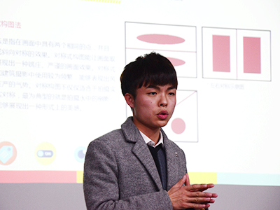 基础知识方面,舒志明同学主要分析了摄影的重要词汇和拍摄模式。为同学们细致的讲解了相机的各种程序模式的设置方法和适用的拍摄场景。摄影构图方面,舒志明同学提出了基本元素的概念,包括主体、陪体、环境等,并分析了构图的基础:保持主体明确、不同景别侧重点不同、不同方位展现不同特征等。构图方法方面,舒志明同学解说了经典构图方法:点、线、面构图法,还拿多张图片为例分析了单个点与多个点表达的情感氛围有所不同。