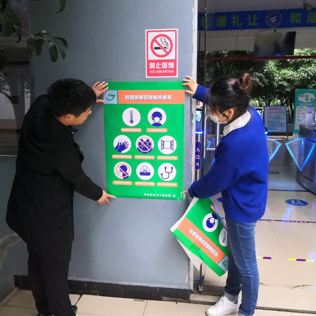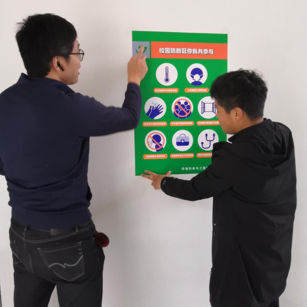随后,郝文佳副书记带领辅导员进行张贴防控疫情小常识 ,增强同学们的防控意识,为同学们的返校工作做好了良好的准备。