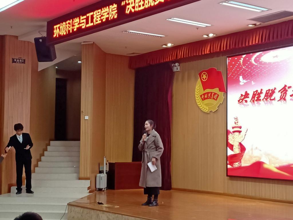 活动伊始,伴随着铿锵有力的《光荣啊,中国共青团》歌声,活动正式拉开帷幕。环工19-1团支部代表谢东妤上台讲解“决战决胜脱贫攻坚战”主题PPT,她为我们讲述了以习近平同志为核心的党中央带领广大人民群众成功走出了一条具有中国特色的脱贫攻坚道路的故事。紧接着,一首慷慨激昂诗朗诵《你的背影》响彻整个会场,以此歌颂坚守在脱贫攻坚一线的扶贫干部。创意满满的《青年小学习》视频,将本场活动氛围推向高潮。随后,支部成员进行情景剧《乌龙快递》表演,向观众们展示了2020年新冠疫情下的逆行者们的壮举,学习他们舍己为人的奉献精神。随着支部成员的《我和我的祖国》大合唱落下尾音,本次大型团日活动也落下帷幕。活动最后,王媛老师对此次活动进行发言总结,肯定了环工19-1团支部为本次活动所做的充足准备,并对活动节目中的创新性行为表示赞许,同时她也希望同学们都能向环工19-1团支部学习,学习他们积极主动的做事态度。