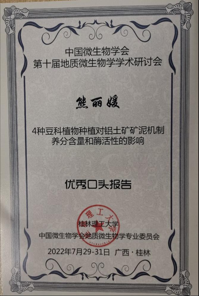 硕士研究生熊丽媛、李雪松在研究生论坛分别以“4种豆科植物种植对铝土矿矿泥基质养分含量和酶活性的影响”“ 平果铝土矿区复垦土壤细菌群落特征及其与理化性质的关系”为题做了汇报交流,其中熊丽媛获得了“优秀口头报告”。同时,黑料吃瓜