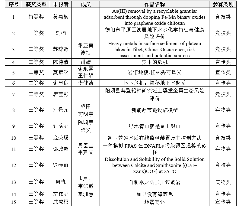 各学院师生的广泛关注,共有50余份作品参加此次竞赛。竞赛由地下水科学与工程教研室的危嵩老师、赵雨晴老师和陈盟老师组成评审组,着重针对参赛作品的专业契合度、作品的科学性与创新性、以及作品的实际应用价值等进行评审。根据奖项设置,经由评审组老师们打分评选出特等奖1项、一等奖1项、二等奖4项和三等奖9项。