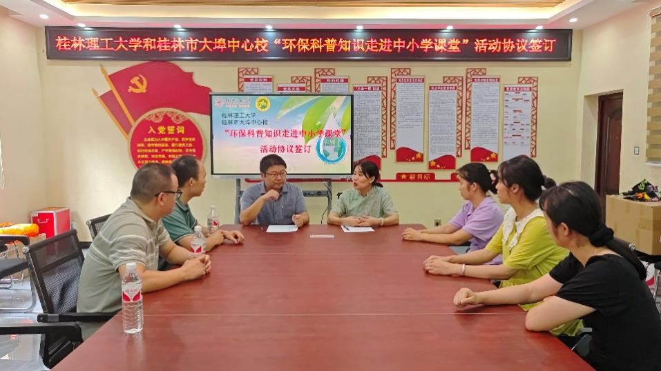 环保科普师生志愿者团队,前往桂林市大埠中心校开展环保科普宣传教育活动,本次活动共分为科普教育合作交流座谈、环保科普小课堂、环保科普小游戏3个环节。