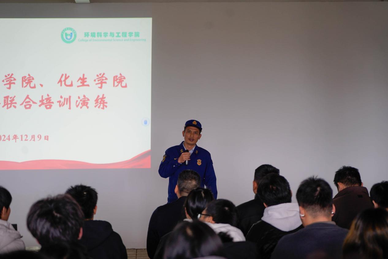 联合化生学院在雁山教十二楼开展了消防知识培训及避险演练活动。环境学院党委书记代武社、化生学院党委书记彭代江、环境学院副院长朱宗强以及学校保卫处、两学院师生代表合计260余人参加了此次培训。