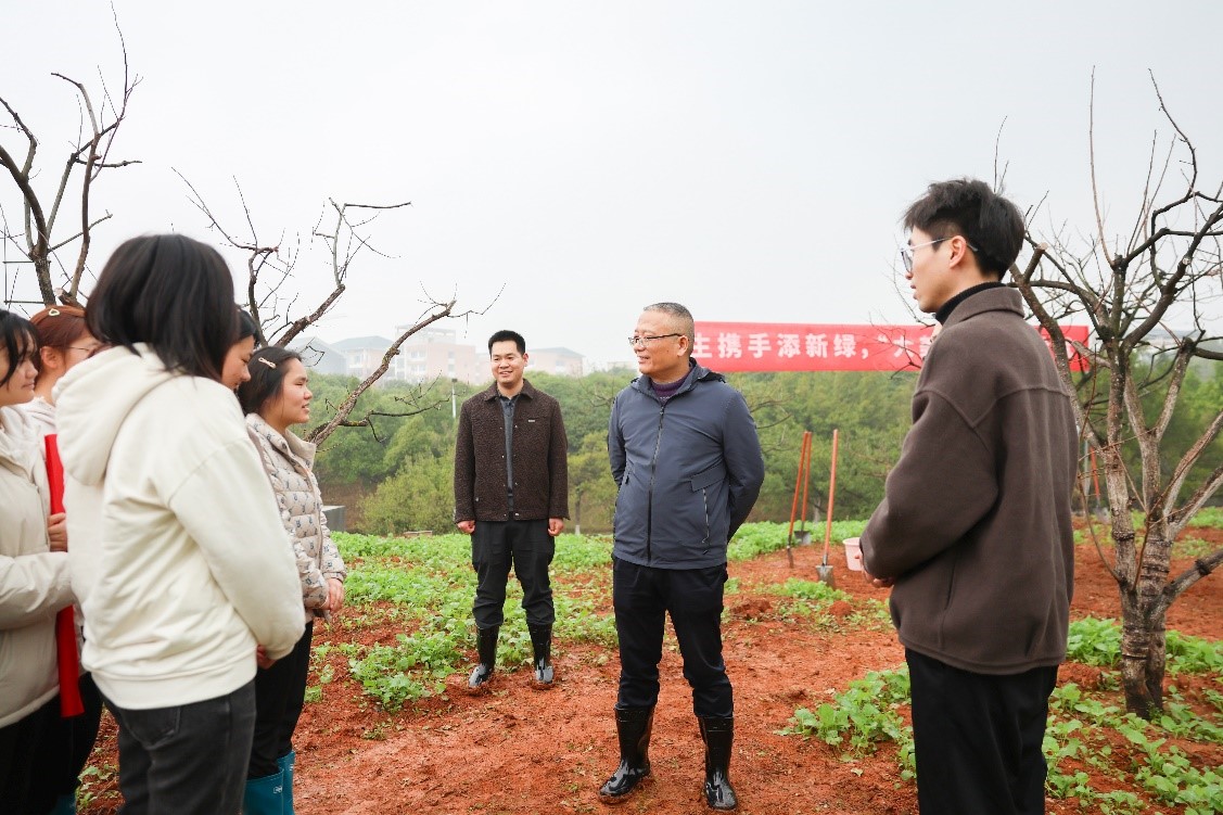 活动现场,师生党员热情高涨,分工协作。王敦球校长率先挥锹铲土,与师生一同扶苗培土、围堰浇水。他一边劳动,一边与学生党员亲切交流,询问大家在专业学习、劳动实践中的感悟。活动过后,王敦球校长向支部师生党员提出三点殷切期望:一是“以党建引领学风,营造浓厚氛围”,他强调学生党员要充分发挥先锋模范作用,以“党建红”引领“学风优”,聚焦学业发展目标,在保研考研、四六级通过上争当表率,不断扎实个人知识和能力;二是“以实践锤炼本领,勇攀科创高峰”,他勉励青年学子“少刷手机屏幕,多拓人生视野”,主动走出宿舍、走进实验室、投身科技竞赛,在“挑战杯”“互联网+”等赛事中锤炼创新能力,在科研实践中锻造核心竞争力;三是“以绿色涵养初心,厚植家国情怀”,他指出环境学子要立足学科特色,将植树护绿的精神延伸到生态文明建设中,积极参与环保实践和志愿服务,用实际行动践行“绿水青山就是金山银山”的发展理念。