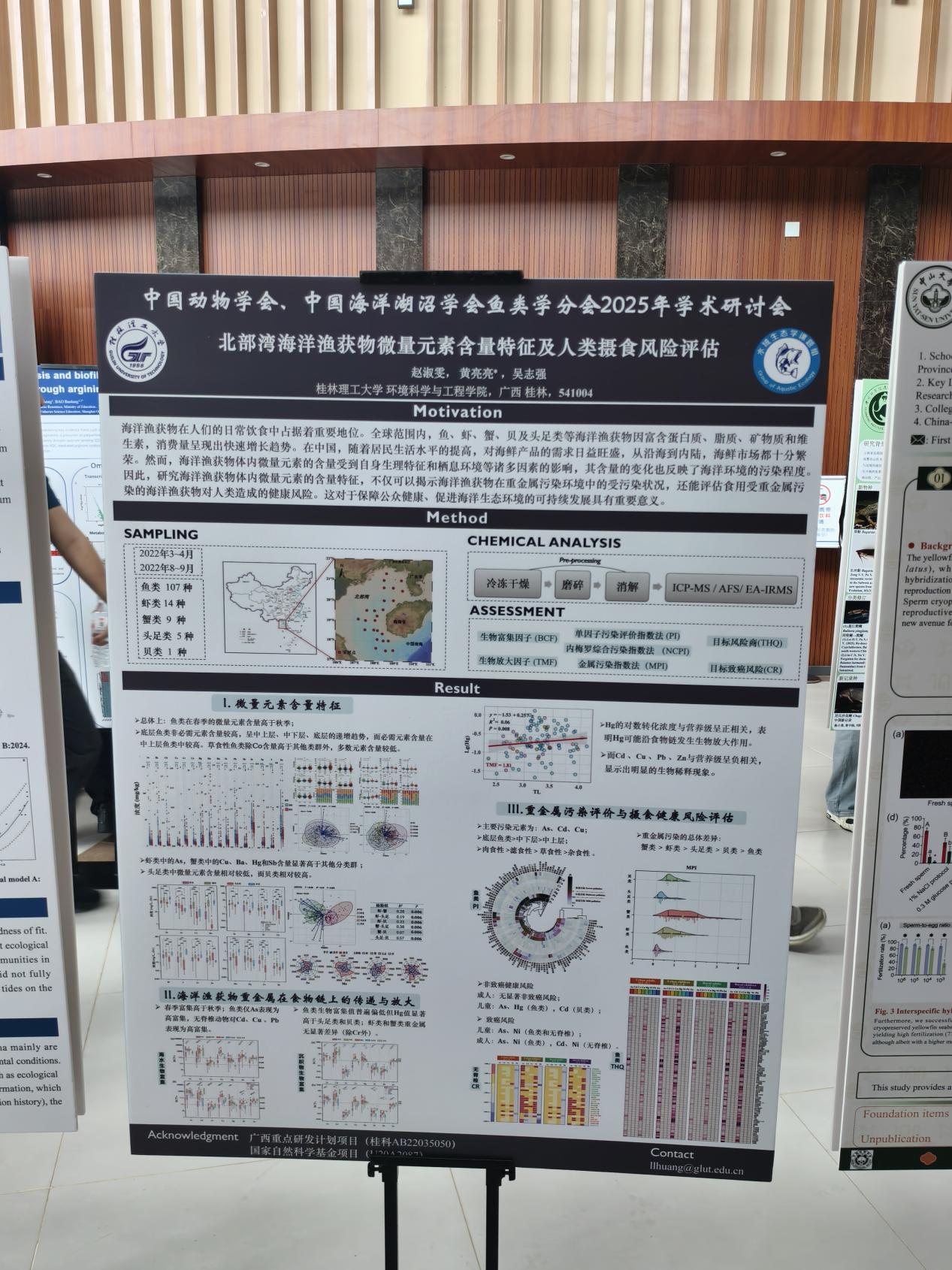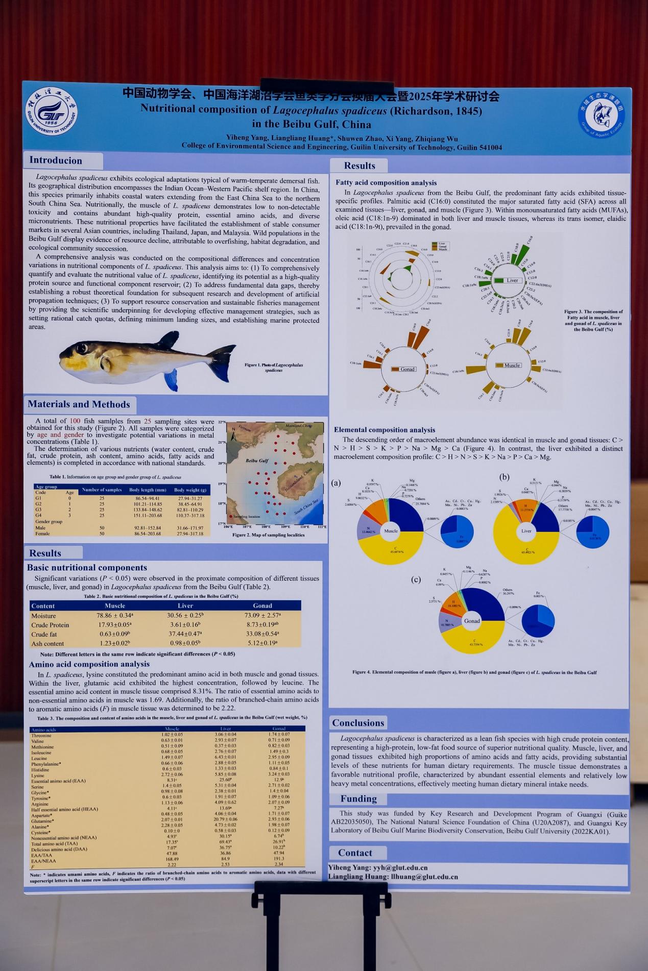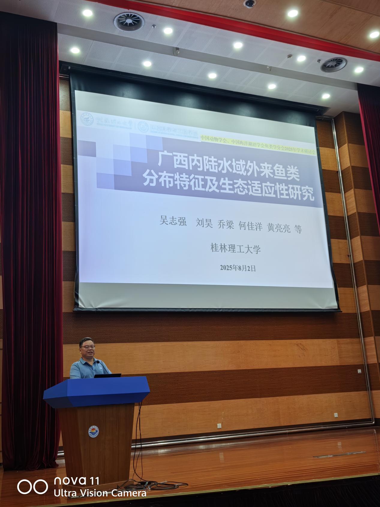 吴志强教授受邀作题为《广西内陆水域外来鱼类分布特征及生态适应性研究》。博士生王才广、硕士生杨雪雯分别以《Elemental homeostasis shapes multidimensional stoichiometric niches in coastal fish communities: Insights from stoichiometric variability in the Beibu Gulf》《湘江西源鱼类物种多样性及时空分布》为题作了汇报交流。硕士生赵淑雯、杨伊恒分别以《北部湾海洋渔获物微量元素含量特征及人类摄食风险评估》《Nutritional composition of Lagocephalus spadiceus (Richardson, 1845)n the Beibu Guf, China》为题作了墙报展示。会议期间,召开了中国动物学会鱼类分会理事会会议,我校吴志强教授当选中国动物学会、中国海洋湖沼学会鱼类学分会第十一届委员会副理事长,黄亮亮教授当选理事。