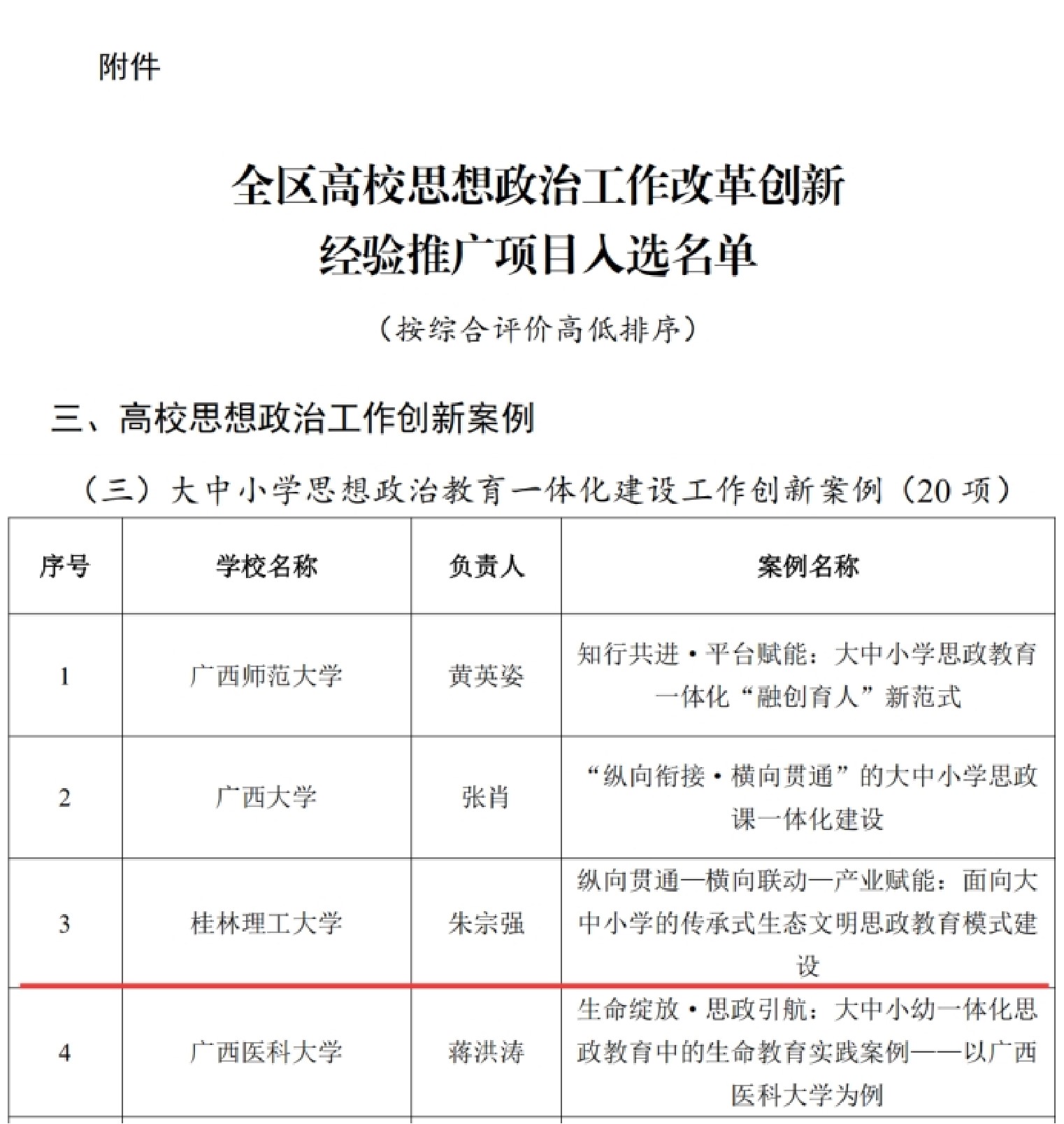 近日,自治区教育厅公布全区高校思想政治工作改革创新经验推广项目入选名单,由学院党委委员、副院长朱宗强教授主持申报的《纵向贯通—横向联动—产业赋能:面向大中小学的传承式生态文明思政教育模式建设》成功入选高校思想政治工作创新案例。
