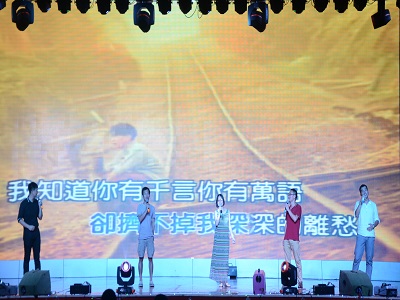 人气歌手包志炜演唱的《一块红布》和陈世杰演唱的《野子》和《梦想天空分外蓝》。晚会并不单调,歌曲唱完后是一个经典有趣的游戏环节——抢凳子。大四同学们积极参加游戏,玩得不亦乐乎,游戏结束后纷纷发表了自己的感想。游戏过后,迎来了整场晚会的高潮。本次晚会为大四学长学姐们准备了毕业蛋糕,在主持人的盛情邀请下,解校长与各领导老师走上晚会舞台为大四同学们切下了甜蜜的蛋糕。温婉大方的大四辅导员夏晴“妈妈”还表达了对“孩子们”美好未来的期望。为带给大四同学们更多美好回忆,工作人员播放了一段12级各班级同学们在大学里成长历程的视频,更有团委学生会成员们对毕业生们诚挚的祝福。接下来,各年级辅导员们为我们大四毕业生送上了一首《祝你一路顺风》,还有黑料吃瓜