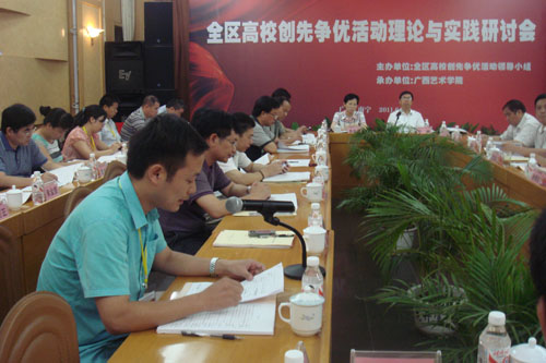 为总结全区高校创先争优活动的经验和做法,深入开展理论与实践研究,掀起全区高校创先争优活动新高潮,6月24日,由全区高校创先争优活动领导小组主办的全区高校创先争优活动理论与实践研讨会在广西艺术学院召开。自治区高校工委副书记秦敬德同志出席会议,自治区高校工委组织部常务副部长宁耀同志主持会议。区内46所高校分管创先争优活动负责人、活动领导小组办公室主任及党建研究工作专家学者、理论工作者参加会议。受学校党委委派,学校创先争优活动领导小组办公室副主任、党委宣传部、统战部副部长秦弘毅、环境学院党委副书记周章明两位同志参加了此次研讨会。