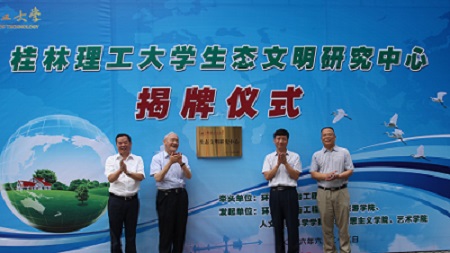 生态文明研究中心在屏风校区正式揭牌成立,中国科学院袁道先院士、广西人力资源和社会保障厅蒋劼副厅长、学校校长解庆林教授、副校长王敦球教授共同为研究中心揭牌。