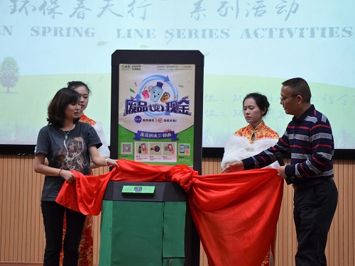 与会人员一同观看了历年“环保春天行”系列活动的视频回顾以及即将在校园推广的CUC智能固废回收终端的视频介绍。伴随轻快的音乐律动,王敦球副校长与何艾莉女士上台为CUC智能固废回收终端揭幕并移交。何艾莉女士代表环保创客联盟为活动致词,她指出CUC智能固废回收终端是传统的垃圾分类与“互联网+”结合的产物,对黑料吃瓜