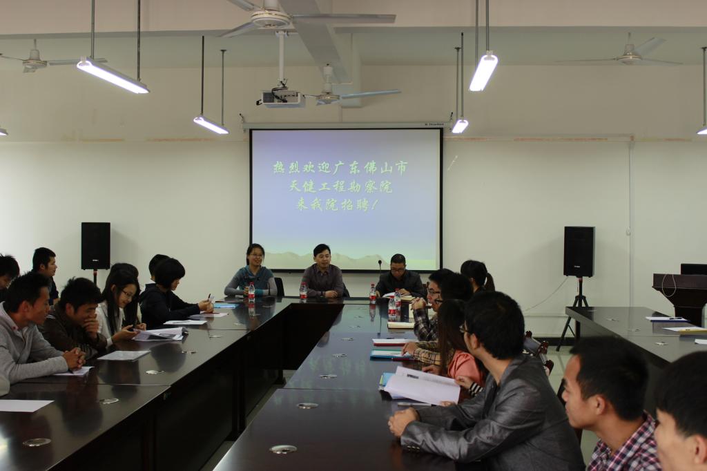进行专场招聘表示欢迎及校友对学院就业工作的支持表示感谢,希望以后在实习基地建设和校企合作方面加强交流与合作。蔡院长随后介绍了广东佛山市天健工程勘察院的企业背景、发展前景及用人需求,并结合当前地质行业发展形势做了就业创业指导与培训,他希望毕业生调整心态,要树立先就业后择业的观念,合理定位职业角色和薪酬水平,在学校练就扎实基本功以应对社会挑战。水文、水工专业近80人参加了招聘宣讲会并与用人单位进行了沟通与交流。