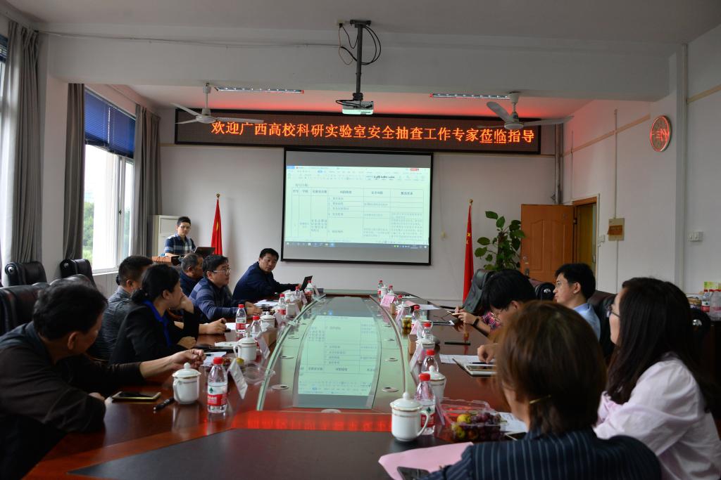 ,对广西高校科研实验室的安全管理工作进行了现场检查,重点检查广西重金属污染防治理论与技术重点实验室。学校科技处处长王磊、副处长莫凌云、保卫处副处长鞠敏敏、学院副院长李艳红以及相关老师陪同检查。