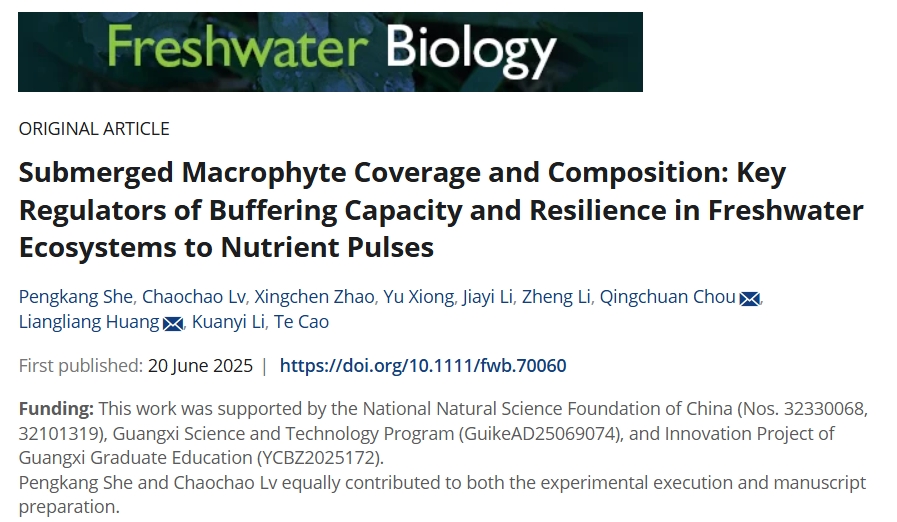 本研究得到了国家自然科学基金项目(32330068, 32101319)和广西科技计划项目(桂科AD25069074)的资助。论文链接://onlinelibrary.wiley.com/doi/10.1111/fwb.70060。