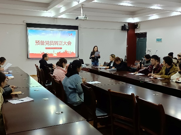 会议伊始,党支部书记岑韫同志向大家宣读预备党员转正的流程和会议纪律,纪检委员宇晓凌同志汇报出席的党员人数,确定出席人数符合组织规定,并宣布会议正式开始。六名预备党员依次上台宣读《转正申请书》,表明自己的入党动机,汇报成为预备党员一年以来自己在工作、学习、生活方面的表现和进步,进行了深刻的总结。然后由预备期期间的联系人发表意见,联系人对各个预备党员的情况进行简单汇报,表扬优点,指出不足的地方并提出建议,说明其是否符合一名中国共产党正式党员的要求。每位预备党员的情况汇报结束后,由现场的正式党员对他们进行提问。最后经过现场正式党员进行无记名投票,会议同意李嘉伟、张宇玲、徐薇、徐赫姝、李秋虹、郭蒂洁正式成为一名共产党员。