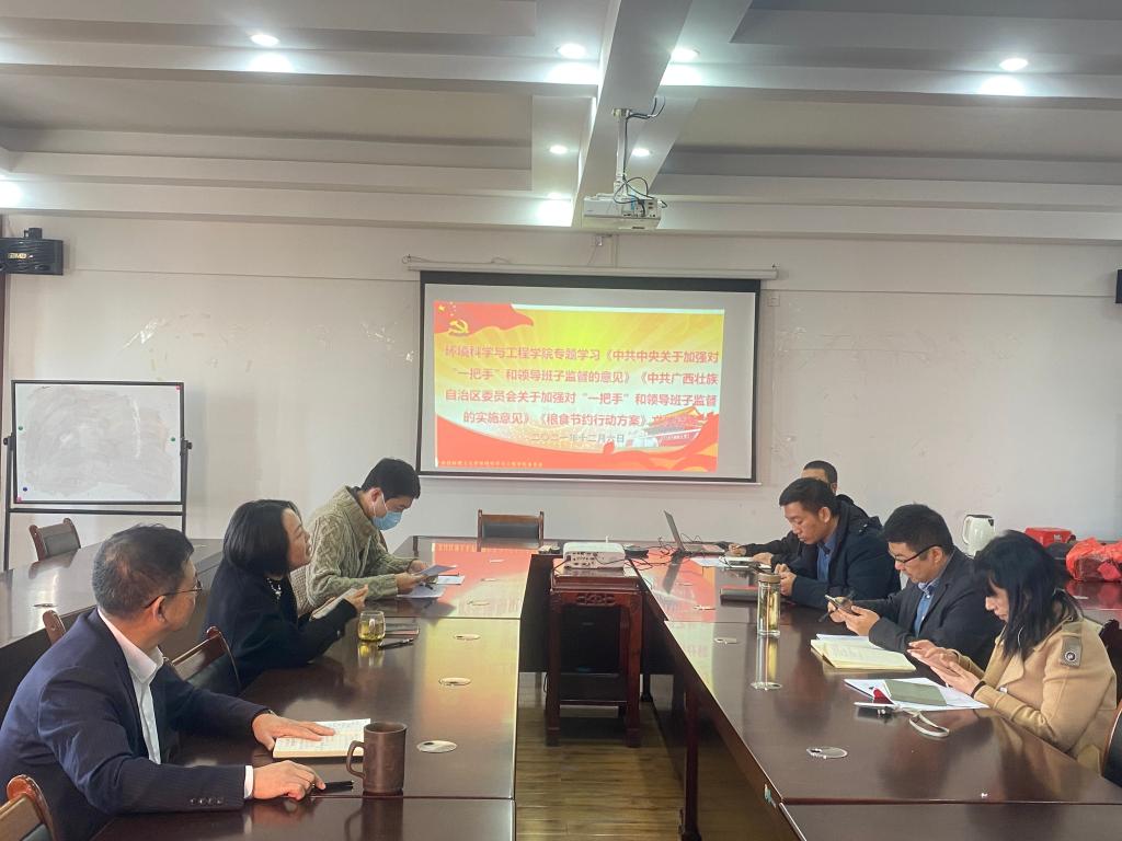 在12407召开专题学习会议,学习《中共中央关于加强对“一把手”和领导班子监督的意见》《中共广西壮族自治区委员会关于加强对“一把手”和领导班子监督的实施意见》《粮食节约行动方案》等文件精神,学院全体在家党政领导参加会议,会议由学院党委副书记、纪委书记郝文佳主持。