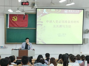 在一班党课开始之前,全体学员集体朗读了方志敏《可爱的中国》(节选),坚定了学员们的爱国信念,激发了学员们的爱党爱国情怀。课上,郝文佳书记重点指出:入党申请人自身必须时刻端正入党动机、提高政治觉悟、严格标准要求,坚决摒弃“把入党当成敲门砖、垫脚石”的不良思想,真正树立坚定的马克思主义信仰、全心全意为人民服务宗旨和为实现共产主义奋斗终身的信念。随后,郝文佳书记带领学员们了解了申请入党必须准备的材料及其撰写方法,并特别强调:从递交申请入党书的那天起,学员们就要以实际行动积极向党组织靠拢,以正确的态度和真诚的努力争取早日成为一名合格的共产党员!
