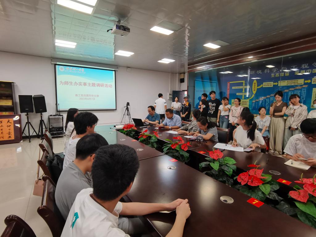 党委教工第四党支部于6月6日-7日在全院范围内开展主题教育活动:为师生办实事走访调研。本次走访调研活动由学院党委委员李艳红、朱宗强主持,党支部书记梁延鹏及实验室、教研室相关教师、研究生参加本次走访调研活动。