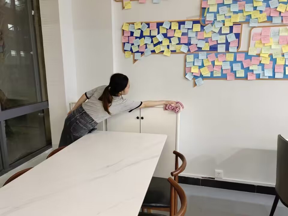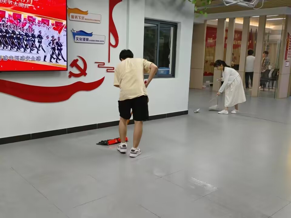 活动开始前,由聂壬婷同志清点到场人数,并对参与人员进行分组,将具体工作安排到个人;活动中,同志们对负责区域进行认真清扫,并对一站式所有窗户,桌椅以及书架进行擦拭,同时将一站式大厅、思政大讲堂和共享厨房的桌椅进行重新摆放;活动最后,大家对负责区域进行仔细检查,将角角落落都清扫干净,清扫结束,全体同志合影留念。