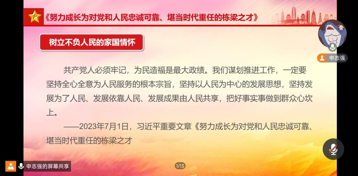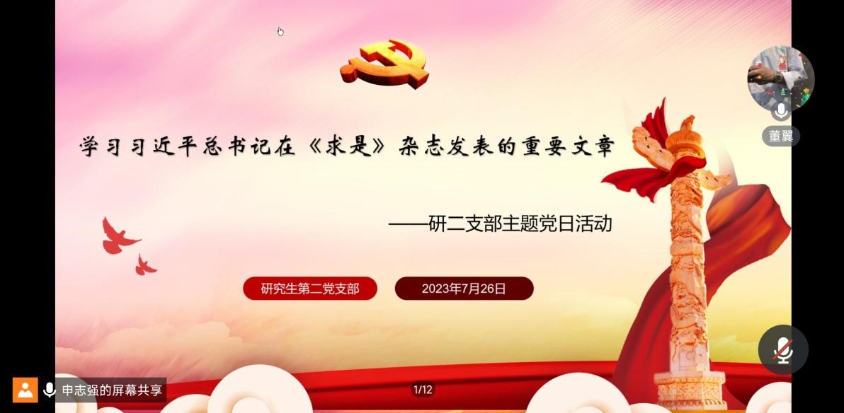 研究生二支部组织开展了以“学习习近平总书记在《求是》杂志发表的重要文章《努力成长为对党和人民忠诚可靠、堪当时代重任的栋梁之才》”为主题的线上党日活动。支部书记及支部全体党员同志参加会议,本次党日活动由支部副书记主持。