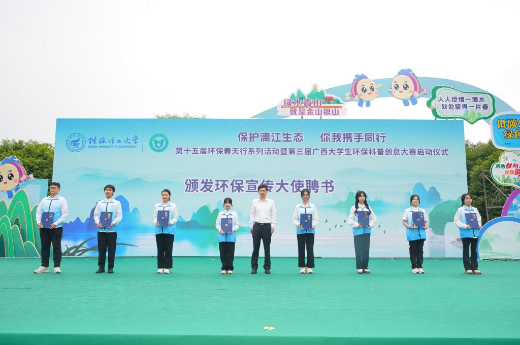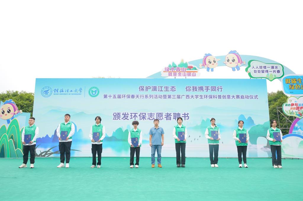 王磊在致辞中向各位嘉宾朋友、老师和同学们表示热烈欢迎。他指出,党的十八大以来,习近平总书记围绕生态环境保护和生态文明建设提出了一系列新理念新思想新战略,把“生态文明建设”纳入“五位一体”总体布局,把“人与自然和谐共生”纳入新时代坚持和发展中国特色社会主义基本方略,把“污染防治”纳入三大攻坚战。他强调,学校将把环保春天行系列活动打造成人才培养的新阵地、服务百姓的新平台、引领生态文明实践的新品牌,进一步增强学校和社会的深度融合发展,保护好漓江、保护好桂林山水,有效提升学校服务能力和百姓生活质量,为谱写中国式现代化广西篇章贡献新的更大力量。