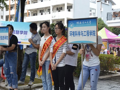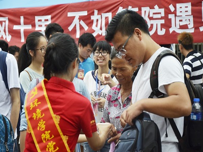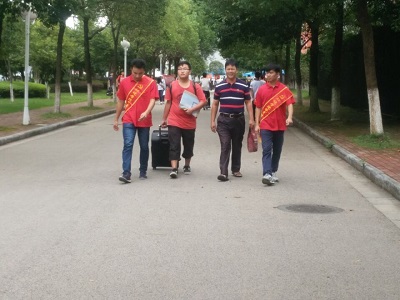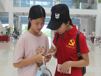 学生党员的迎新地点就在一个小角落,但是在整个校园里,无论是住宿区还是图书馆等,你都能发现党员志愿者们热情活力的身影。他们身穿统一制作的印有院标、党徽及环境学院党员迎新服务志愿者字样的红色衣服,不停地穿梭在校道上,热情细心地引导新生完成报到流程,帮助新生搬运行李,并积极介绍校园环境和大学生活经验。