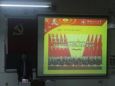党委书记王璐就时间、主题、主要议程方面对“中国共产党第十九次全国代表大会”进行了详细的阐释。同时,王书记带领大家简单学习了经党的十九大修改后的党章,他强调指出:会议将习近平新时代中国特色社会主义思想写入党章。随后,王书记用幽默风趣的语言并结合自己多年党内工作经验对党的十九大报告精神的重点内容作了简述。最后,王书记引用“罗曼罗兰——标志时代最灵敏的晴雨表是青年人”等名人名言,告诫学生党员们要“不忘初心、牢记使命”,学会拒绝诱惑,努力学习科学文化知识,以身作则,努力成为创造新时代的攻坚力量,去实现中华民族伟大复兴梦。