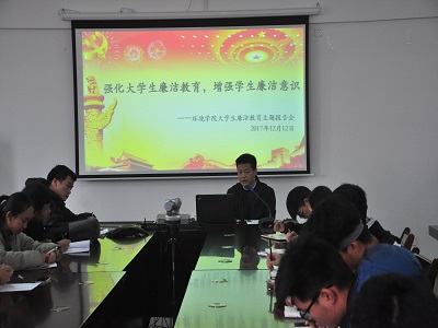 在雁山校区萃华楼12407会议室组织开展大学生廉洁教育主题报告会,此次报告会有学院党委书记王璐老师主讲,全院班团干部参加主题报告会。
