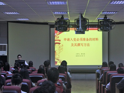 党课上,郝文佳书记为同学们梳理了党员发展流程,对入党积极分子阶段、发展对象阶段、预备党员阶段等每个环节的要求做了详细的讲解,期间郝文佳书记着重强调了入党申请书及转正志愿书的写法和注意事项,使同学们对入党申请书的写法要求更加明确。培训课程尾声,郝文佳老师对同学们提出几点期望,希望同学们能在课余时间多了解党情党史,尽早树立自己的人生目标,明确入党的目的,争取早日成为一名合格的中国共产党党员。