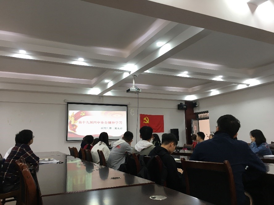 研究生二支部在雁山校区萃华楼12407会议室组织学习了十九届四中全会精神.党支部第一书记李楠老师主持会议,党支部全体党员同志参加会议。