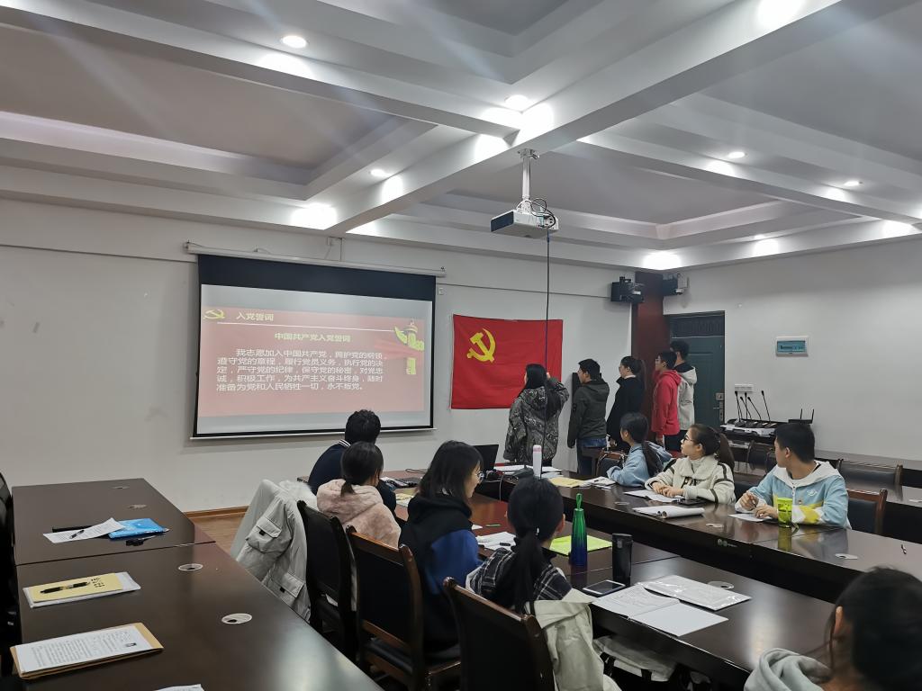 会议开始,张颖颖同志宣读此次预备党员接受大会的流程及相关事项。接下来,各位发展对象相继宣读入党志愿书,并就个人基本情况、入党动机、党性认识与现实表现等方面向组织做出汇报。在每一位发展对象做出汇报后,在场党员同志对其入党问题进行讨论并发表意见,随后该同志作表态发言。接下来,支部在场党员以无记名投票的方式对接收该同志为中共预备党员的问题进行表决,四位同志均以20票赞成,0票反对,1票弃权的结果被接受为预备党员。接收大会后,四名同志在张颖颖同志的带领下面对党旗进行庄严的入党宣誓。