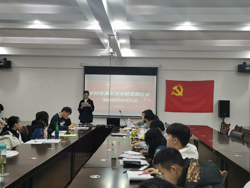 本科生第三党支部在雁山校区12407会议室召开2020年秋季学期预备党员接收大会,会议由党支部副书记张颖颖同志主持。会议主要讨论关于接收韦耀镕、黎威、崔贞雍和王蓉四名同志为中共预备党员的相关问题。除一人请假外支部全体党员同志参加了本次会议。