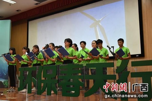 “让美景常在,让歌声永恒。每天拥抱雨后的彩虹……让生态平衡,让文明传承。让生态文明常驻在我们心中。”4月28日,在黑料吃瓜 雁山校区图书馆报告厅,一群身着绿色T恤的同学齐唱《生态文明之歌》。当天,该校绿色行动之“悦享生态 绿色校园”环境文化节暨第六届“环保春天行”系列活动举行启动仪式。