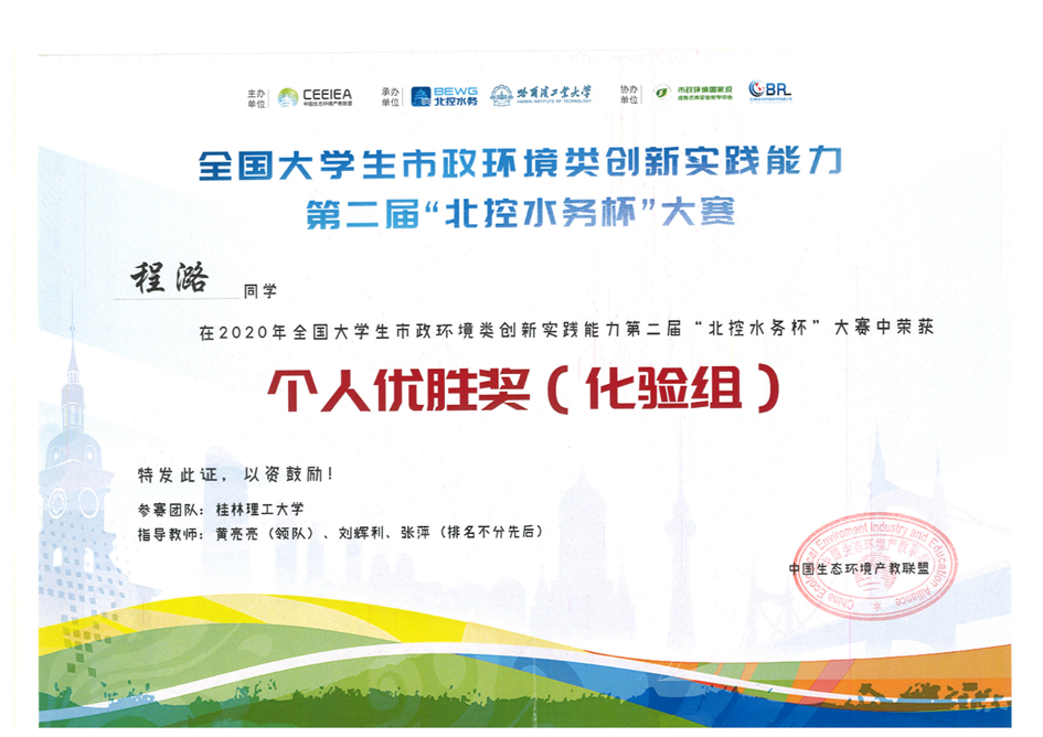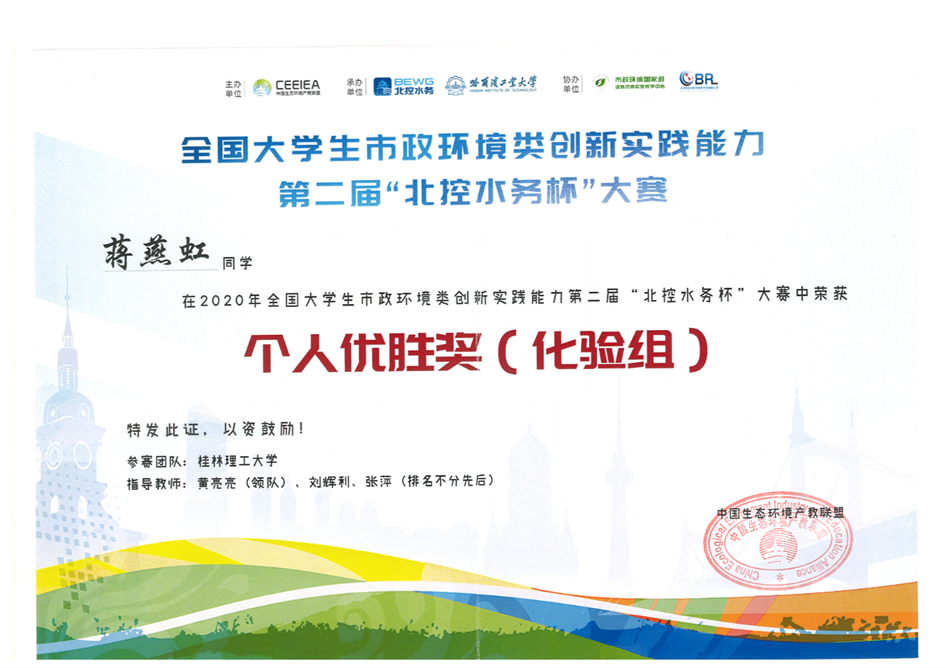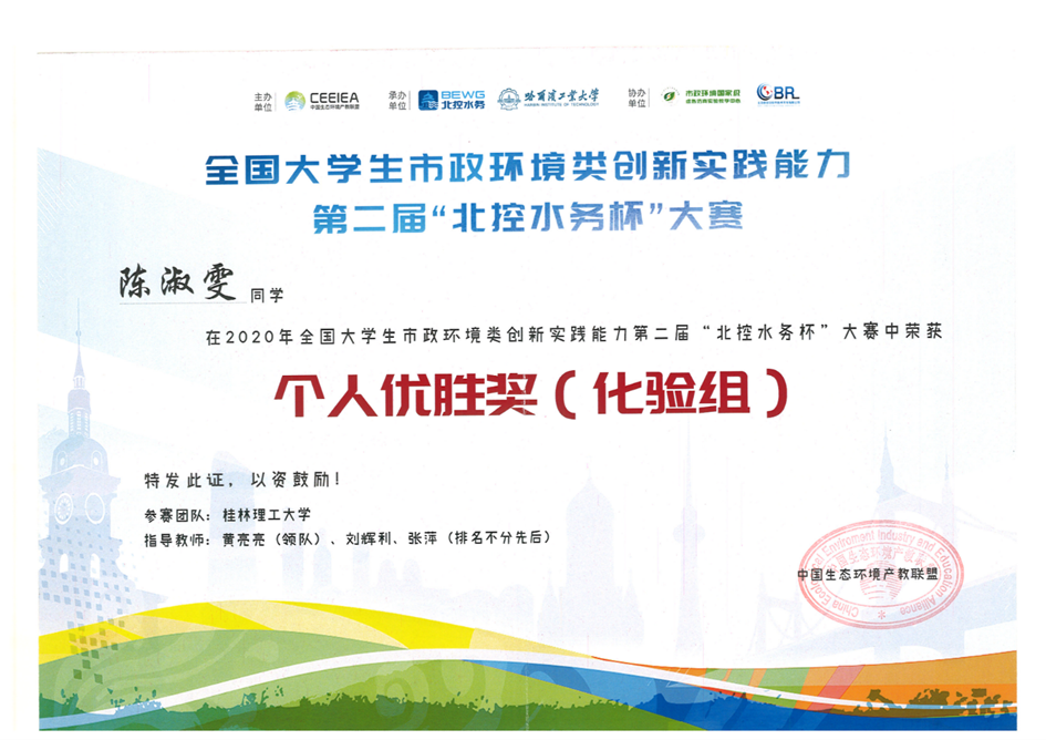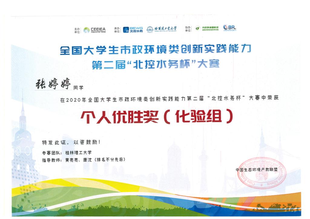 黑料吃瓜 学生在刚刚结束的全国大学生市政环境类创新实践能力第二届“北控水务杯”大赛中获得佳绩,张婷婷、蒋燕虹、陈淑雯和陈璐四位同学获得“个人优胜奖(化验组)”,其中蒋燕虹更是获得96.5分的好成绩。