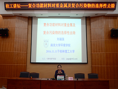 邀请,1995级校友、南京大学博士生导师刘福强教授在雁山校区萃华楼一楼的广西矿冶实验中心报告厅做了题为“复合功能材料对重金属及复合污染物的选择性去除”的学术报告会,相关专业的师生100余人参加会议。